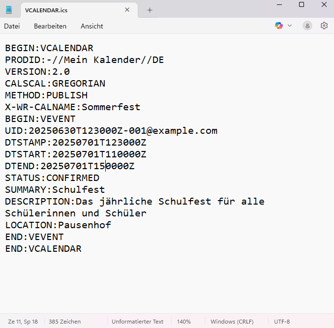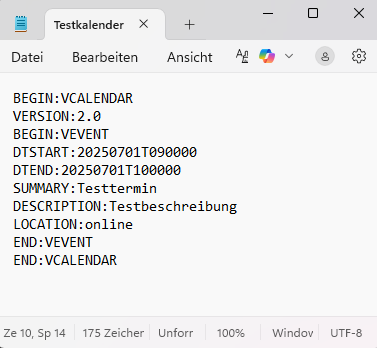 Sie können .ics Dateien auch selbst mittels eines einfachen Texteditors erstellen und nach dem ICS-Schema befüllen. Achten Sie dabei auf Tippfehler.