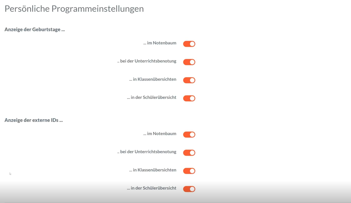 - In den Einstellungen ist es der Administration nun möglich, auszuwählen, ob externe IDs sowie Geburtstage der Schüler angezeigt werden sollen. Bitte beachten Sie: Falls Sie sich dazu entscheiden sollten, diese Angaben anzeigen zu lassen, müssen Sie vorher synchronisieren.