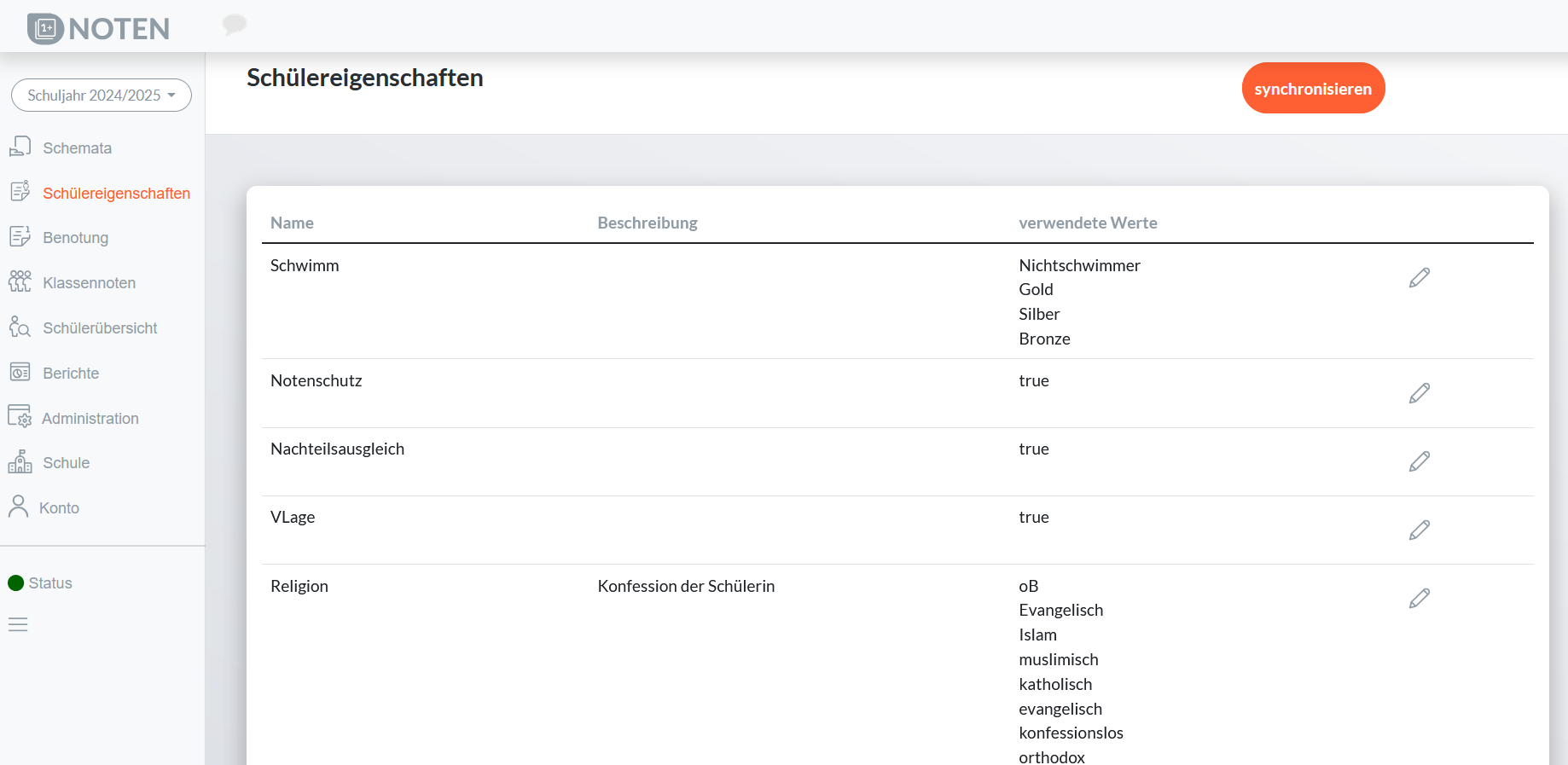 Unter Schülereigenschaften im Menü können Sie die Schülereigenschaften wie Schwimmfähigkeit, Nachteilsausgleich, Religionszugehörigkeit und andere über WebUntis abrufen und bearbeiten.