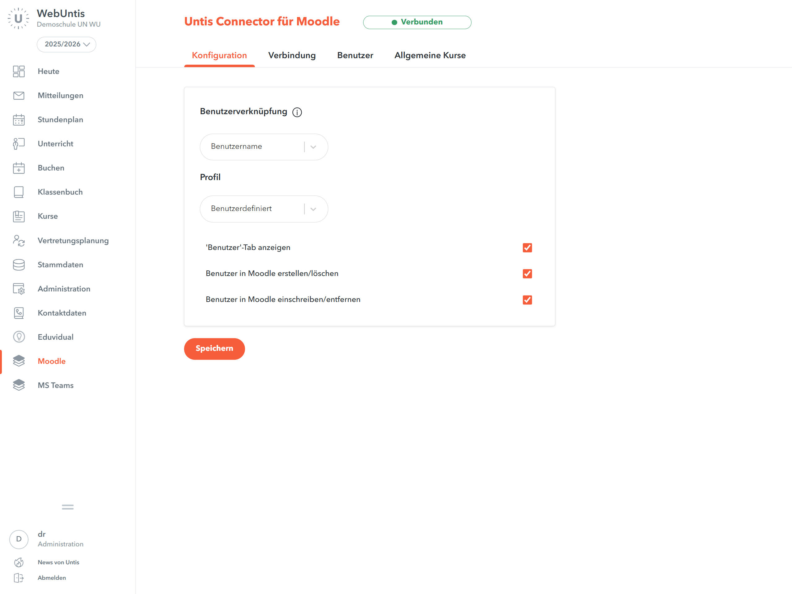 Im Reiter Konfiguration des Untis Connectors für Moodle legen Sie fest, wie Benutzer zugeordnet und welche Verwaltungsfunktionen im Connector verfügbar sind.