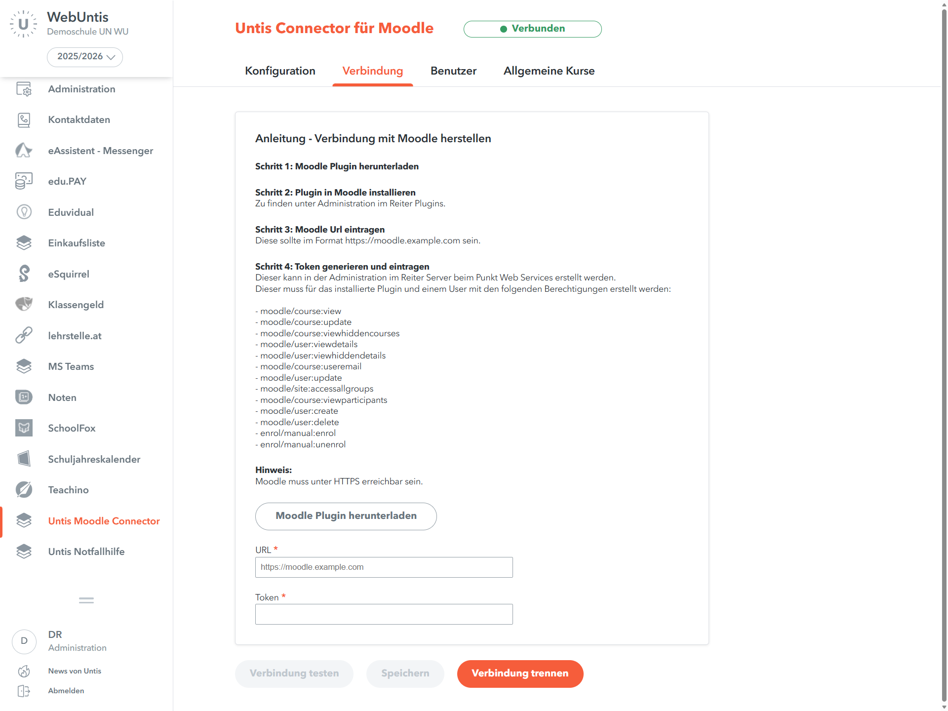 Im Reiter Verbindung stellen Sie die Verbindung zwischen WebUntis und Ihrer Moodle-Instanz her.