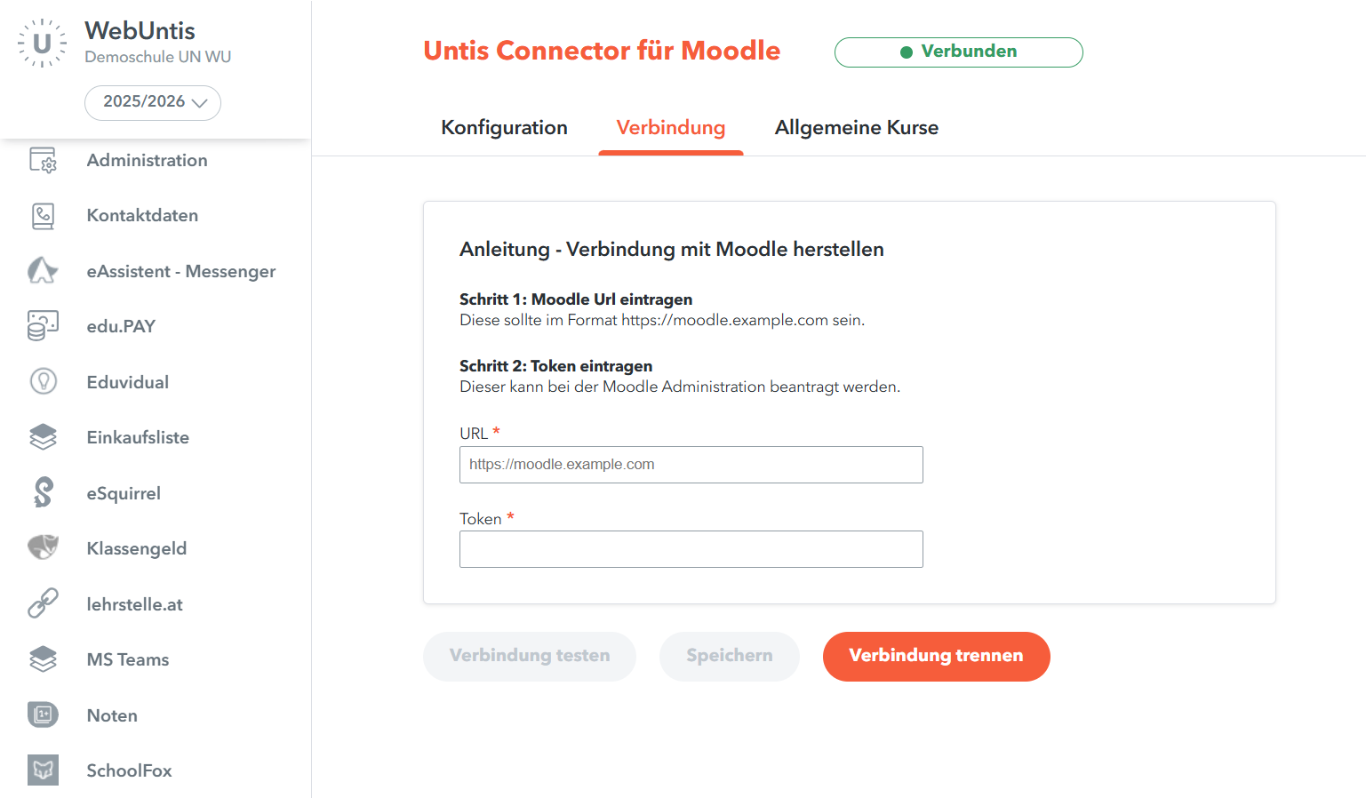 💡Der Token wird von der Moodle-Administration bereitgestellt. - Verbindung testen und anschließend Speichern.