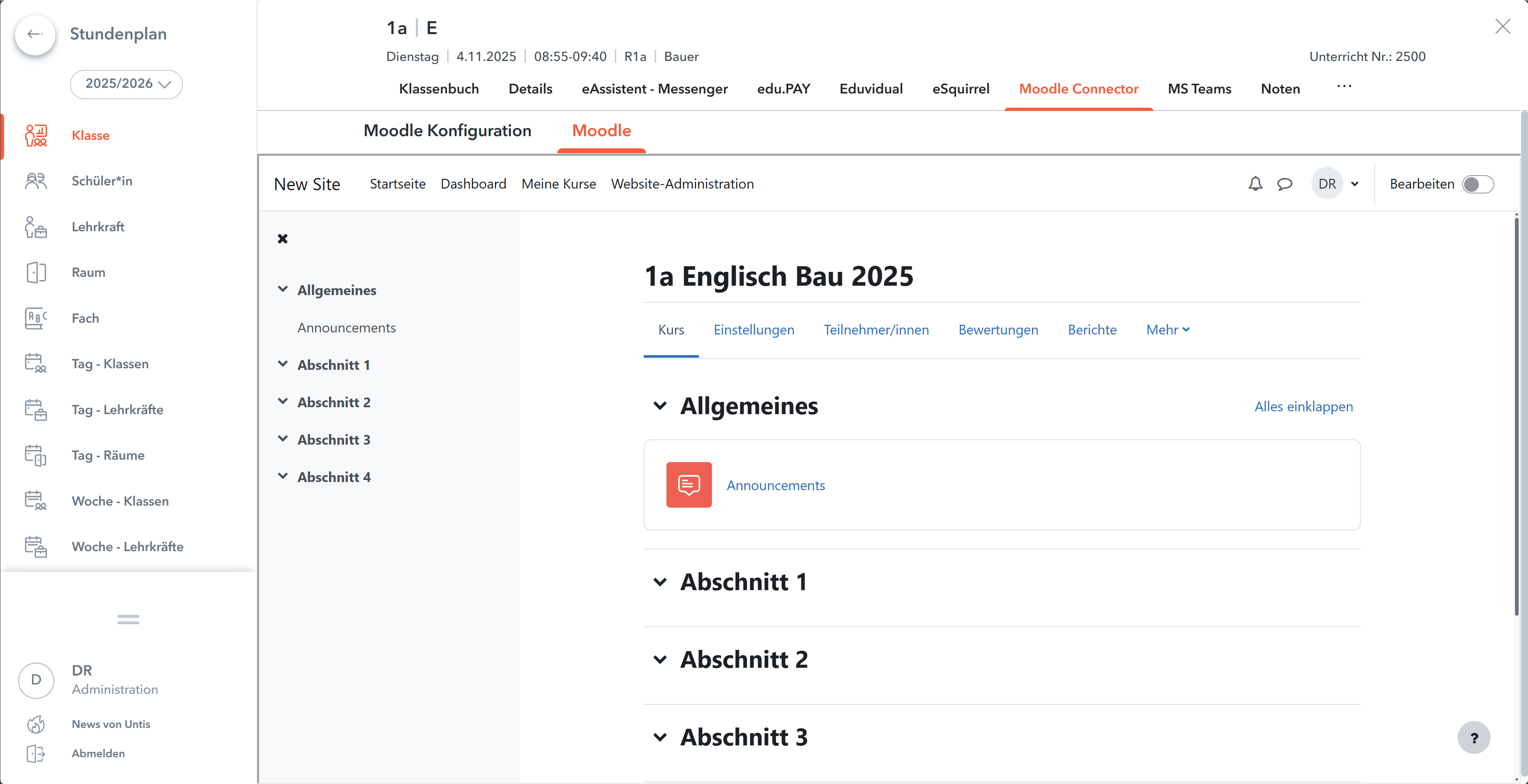 Mit dem Untis Connector für Moodle kann der verknüpfte Moodle-Kurs direkt im WebUntis-Fenster (iFrame) geöffnet werden.