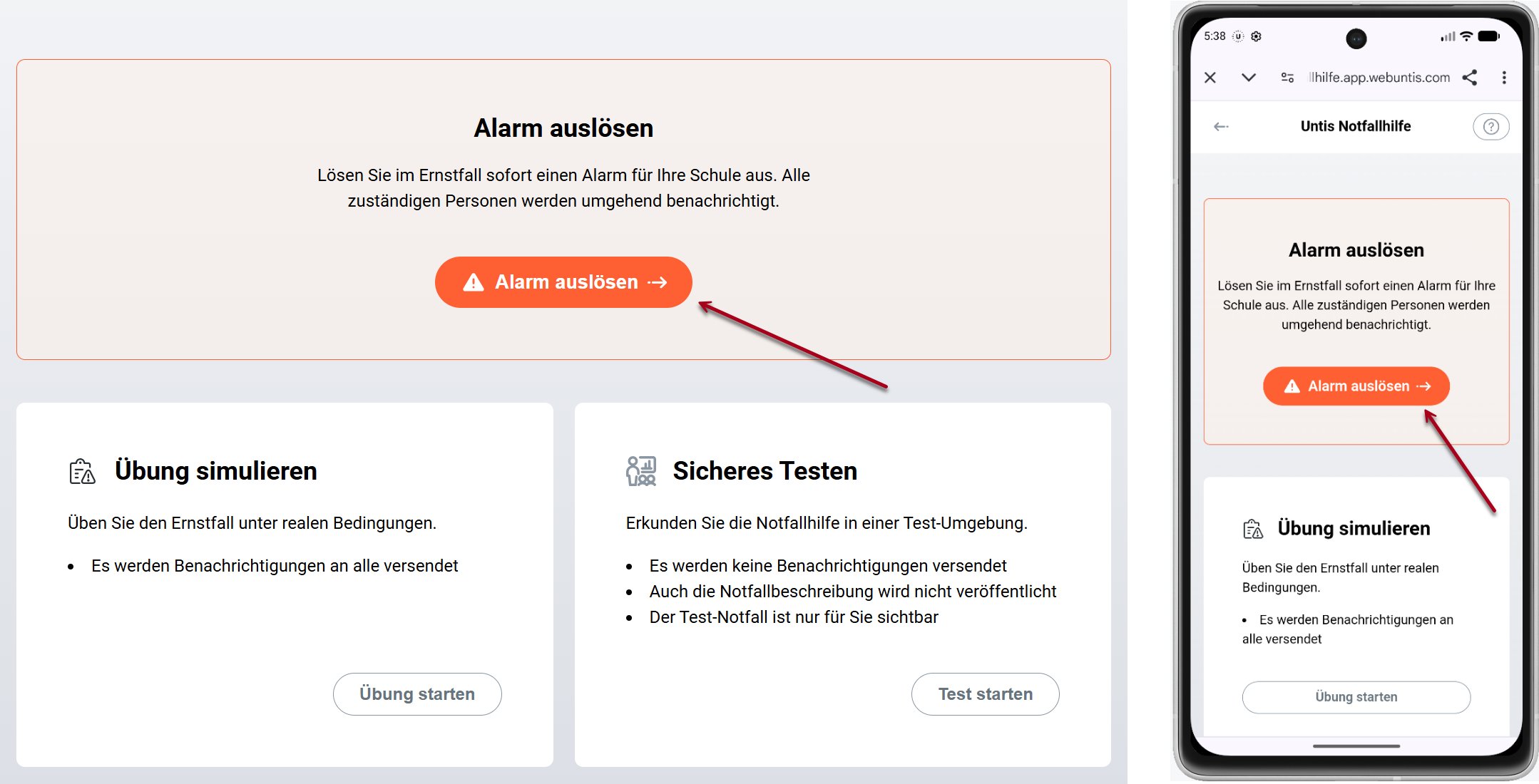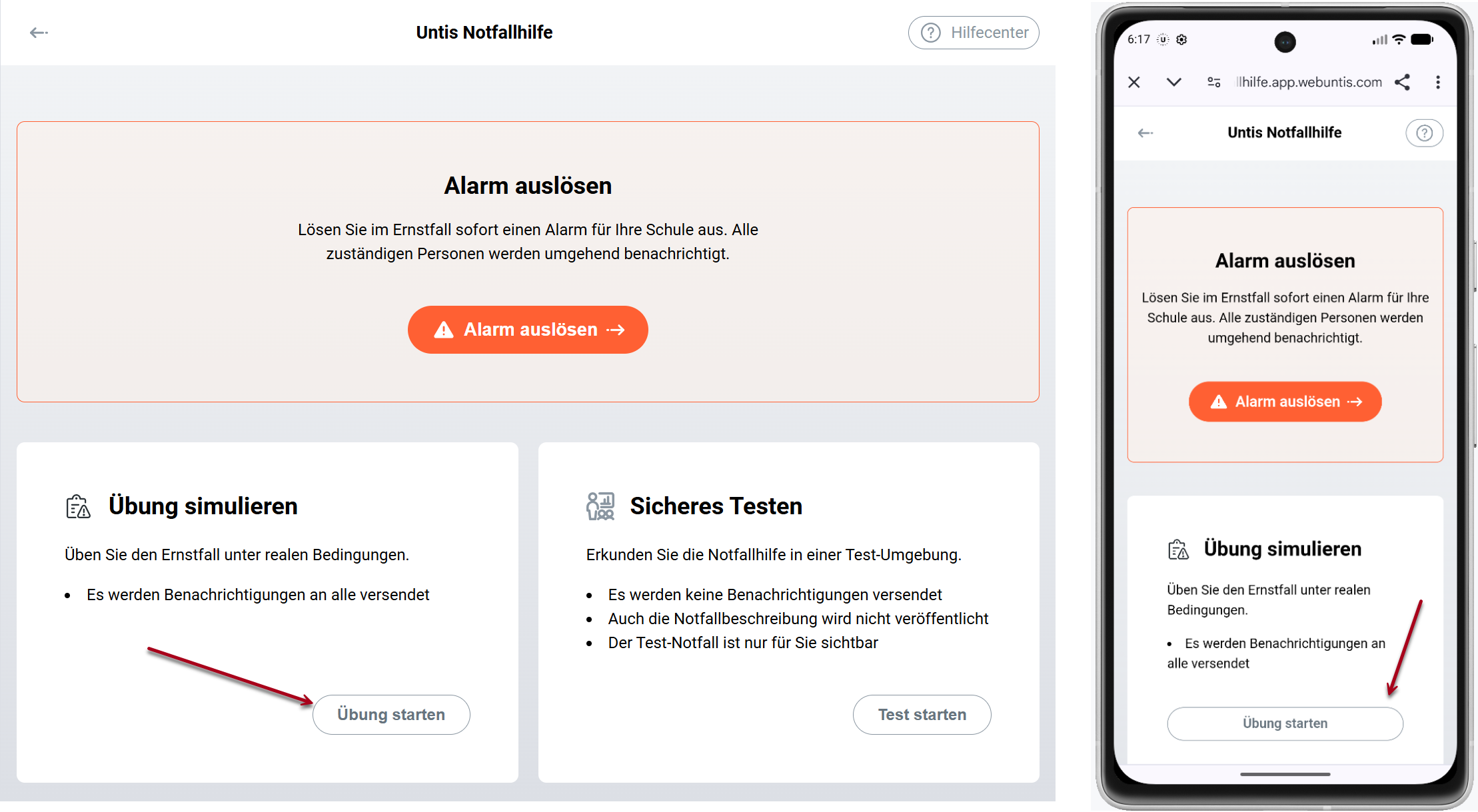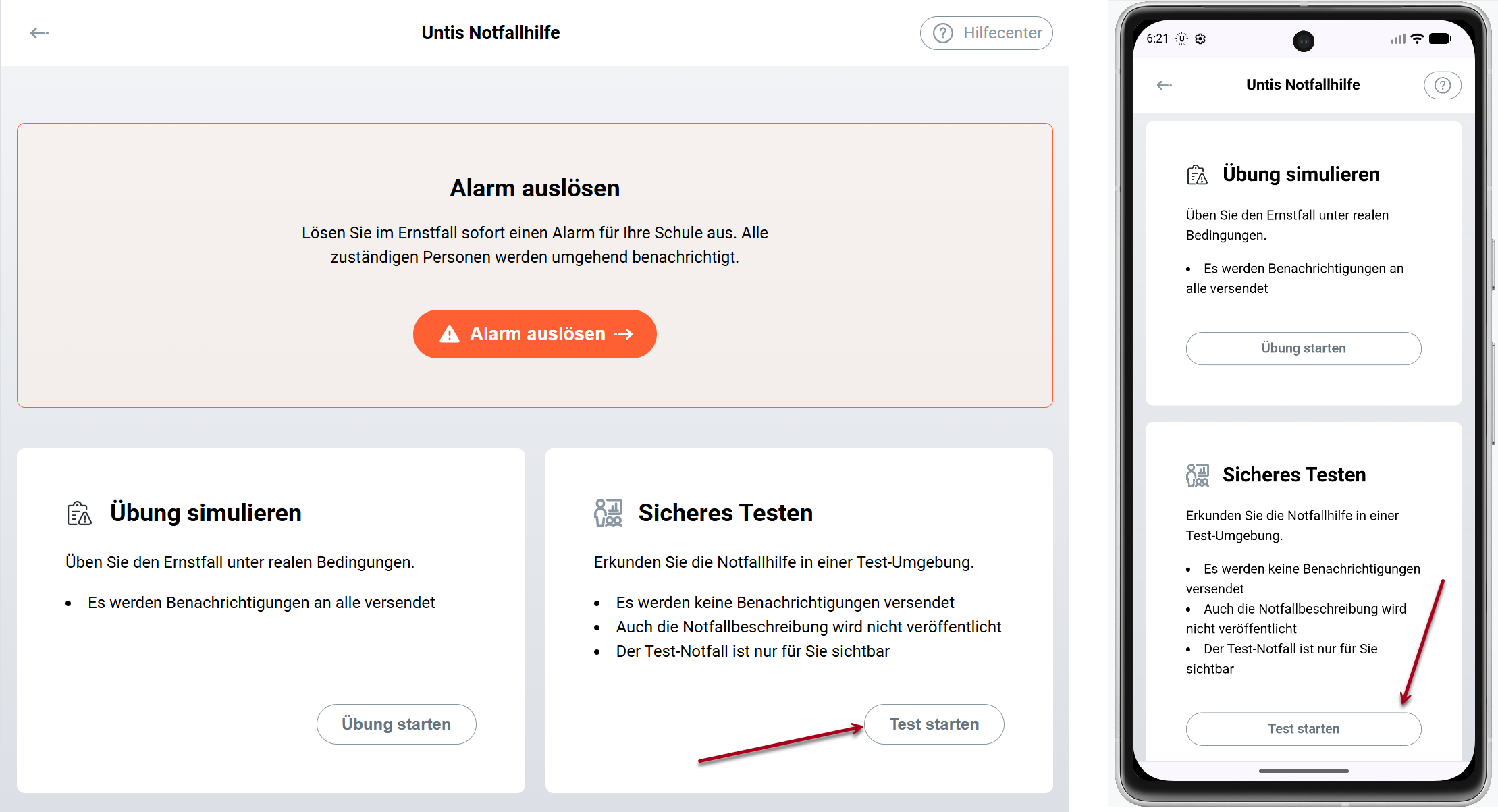 Dieser Modus gibt Ihnen den Möglichkeit, sich mit meisten Funktionen der Notfallhilfe vertraut zu machen, ohne den Schulbetrieb zu stören.