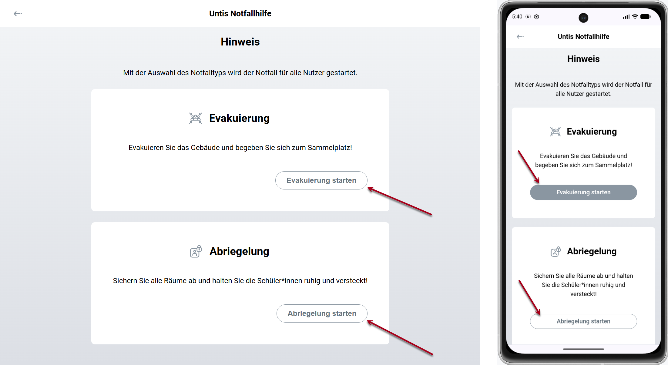 Durch die Auswahl der Schaltflächen <Evakuierung starten> oder <Abriegelung starten> wird der Notfall ausgelöst, und schulinterne Personen über das Mitteilungssystem benachrichtigt.