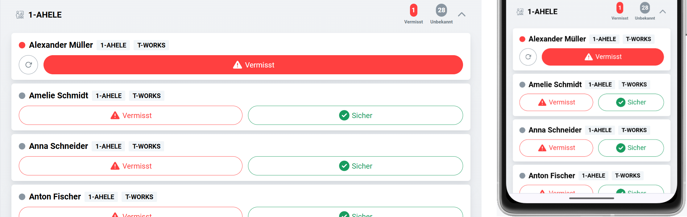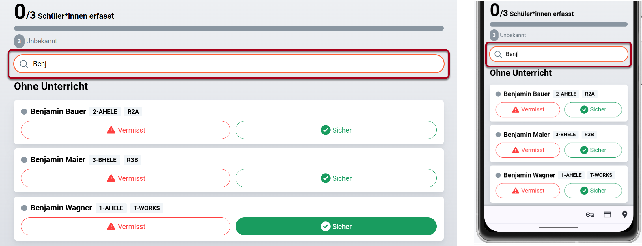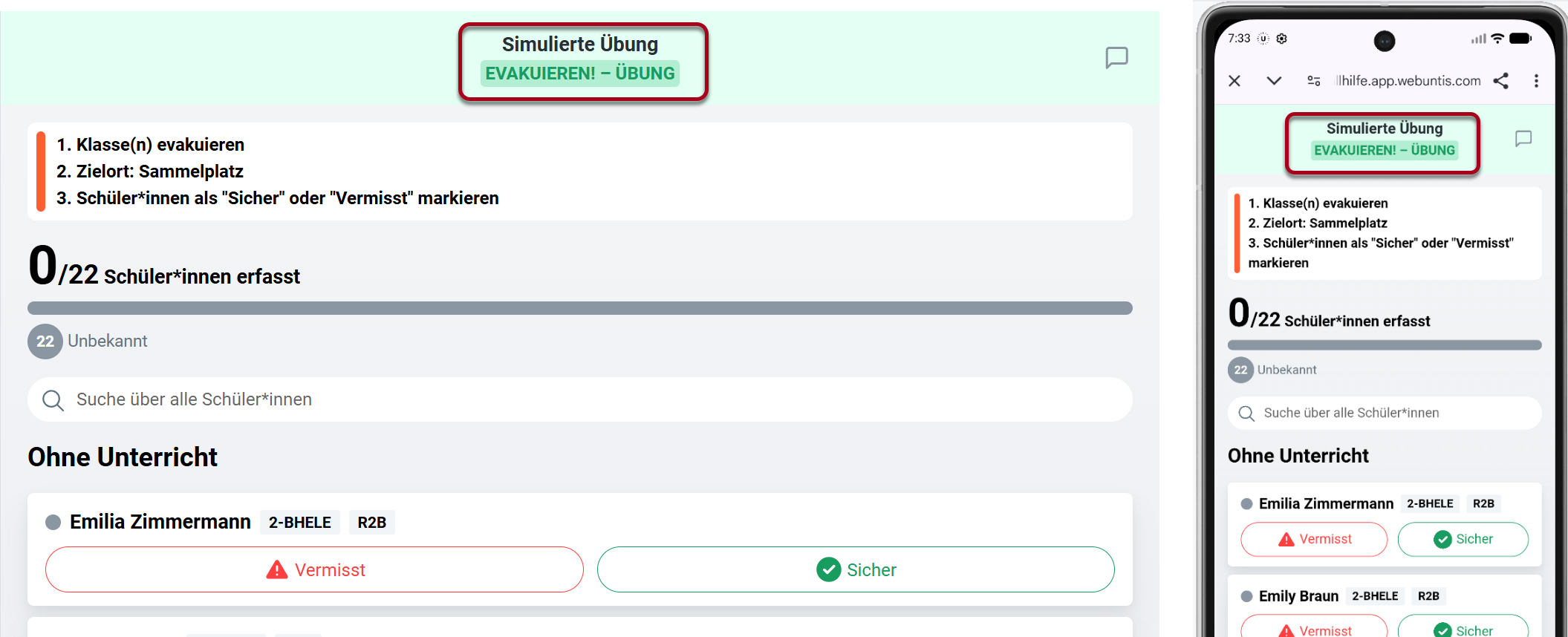 Die Information, wer als gesichert bzw. vermisst gilt, wird über alle Benutzer*innen live synchronisiert - meldet eine andere Lehrkraft eine ihrer Schüler*innen als vermisst/sicher, wird Ihnen dies entsprechend angezeigt (und umgekehrt).