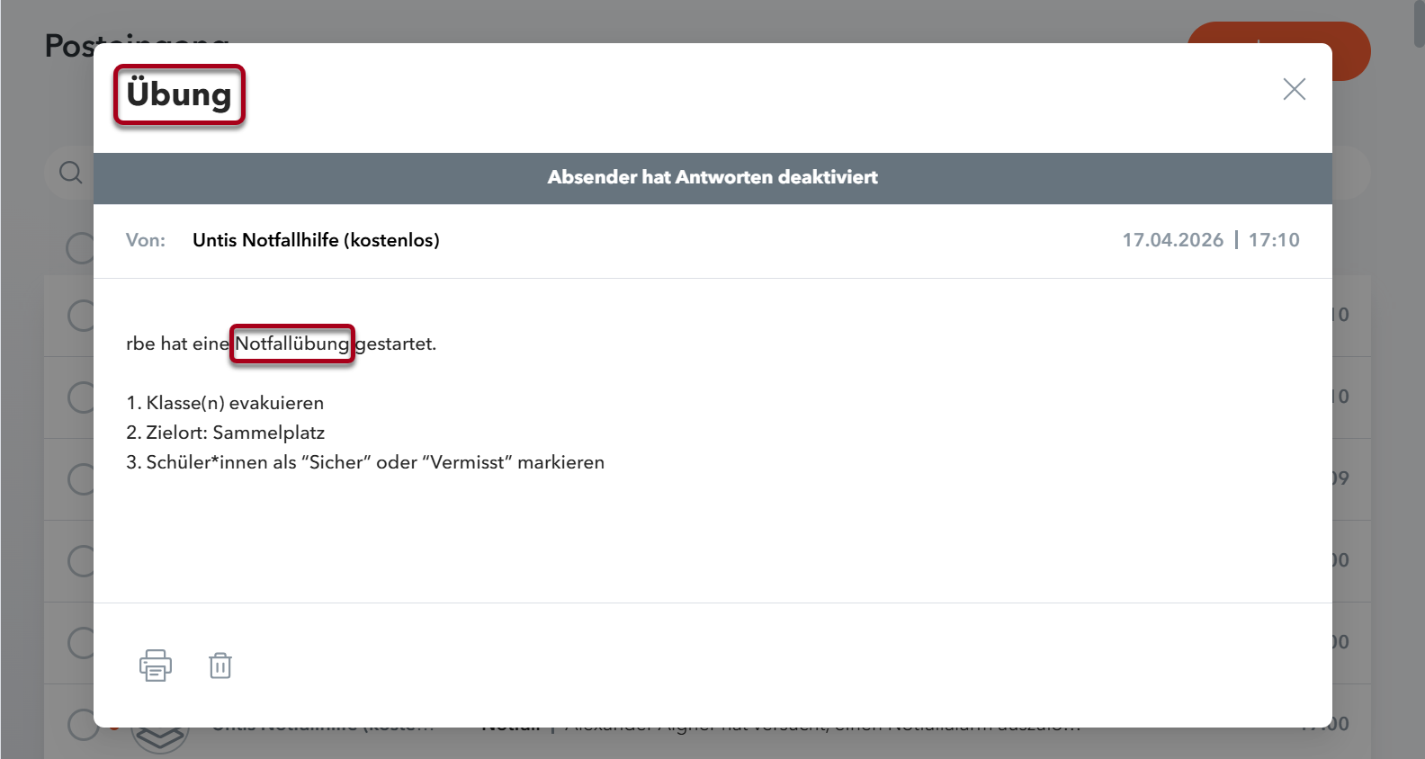 Im Falle eines ausgelösten Notfallalarms erhalten Sie eine WebUntis Mitteilung (inklusive Anweisung, was zu tun ist - und Info, ob es sich um eine Übung oder einen Notfall handelt).