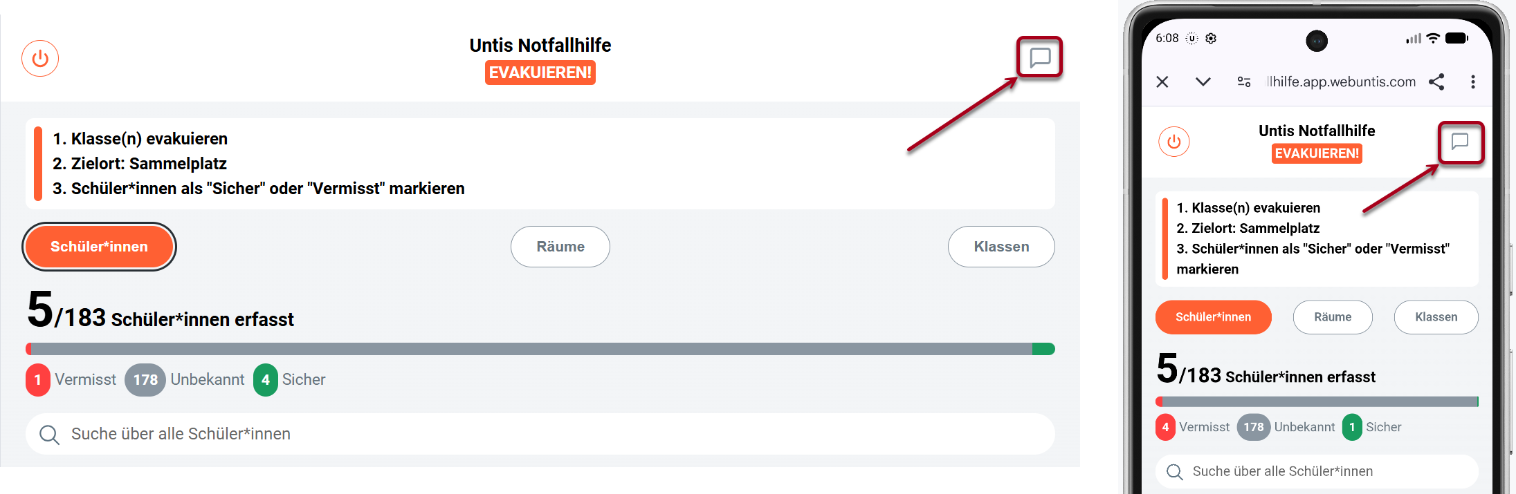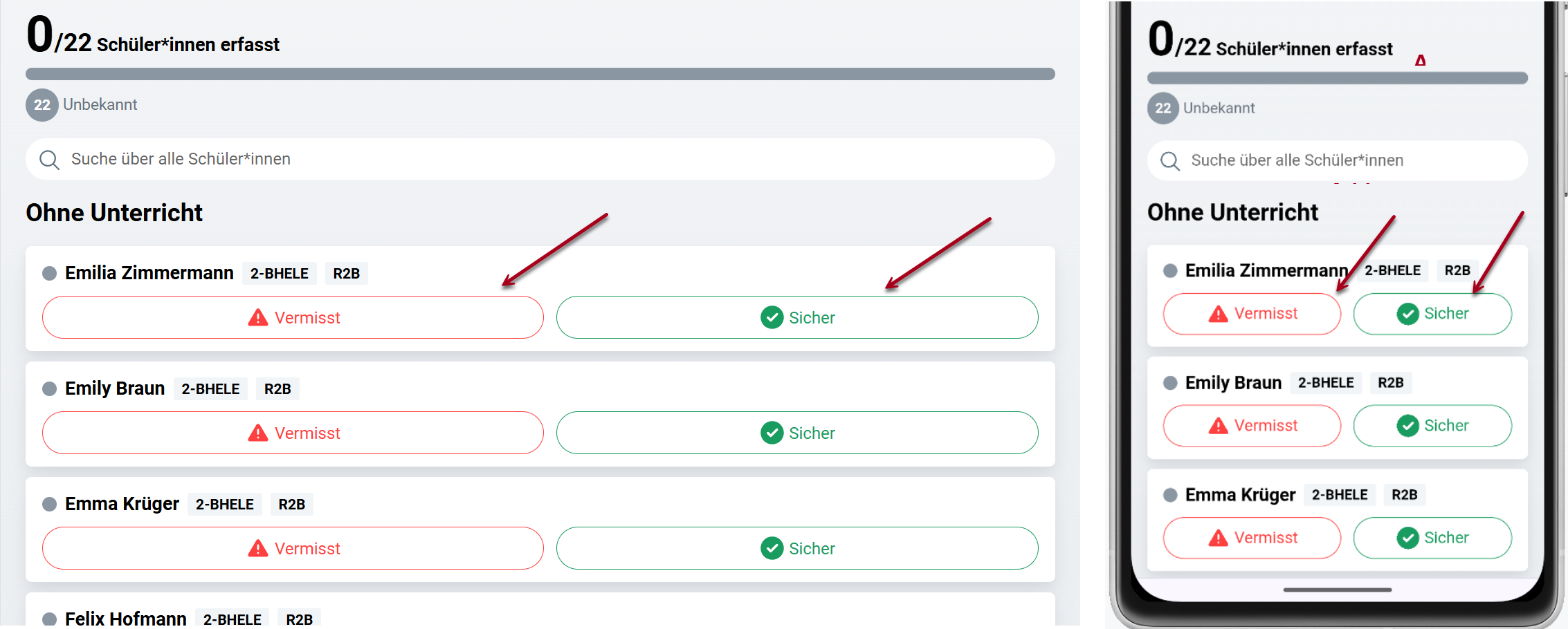 Über die Schaltflächen <Vermisst> und <Sicher> können Sie einfach und schnell den Status Ihrer Schüler*innen erfassen..