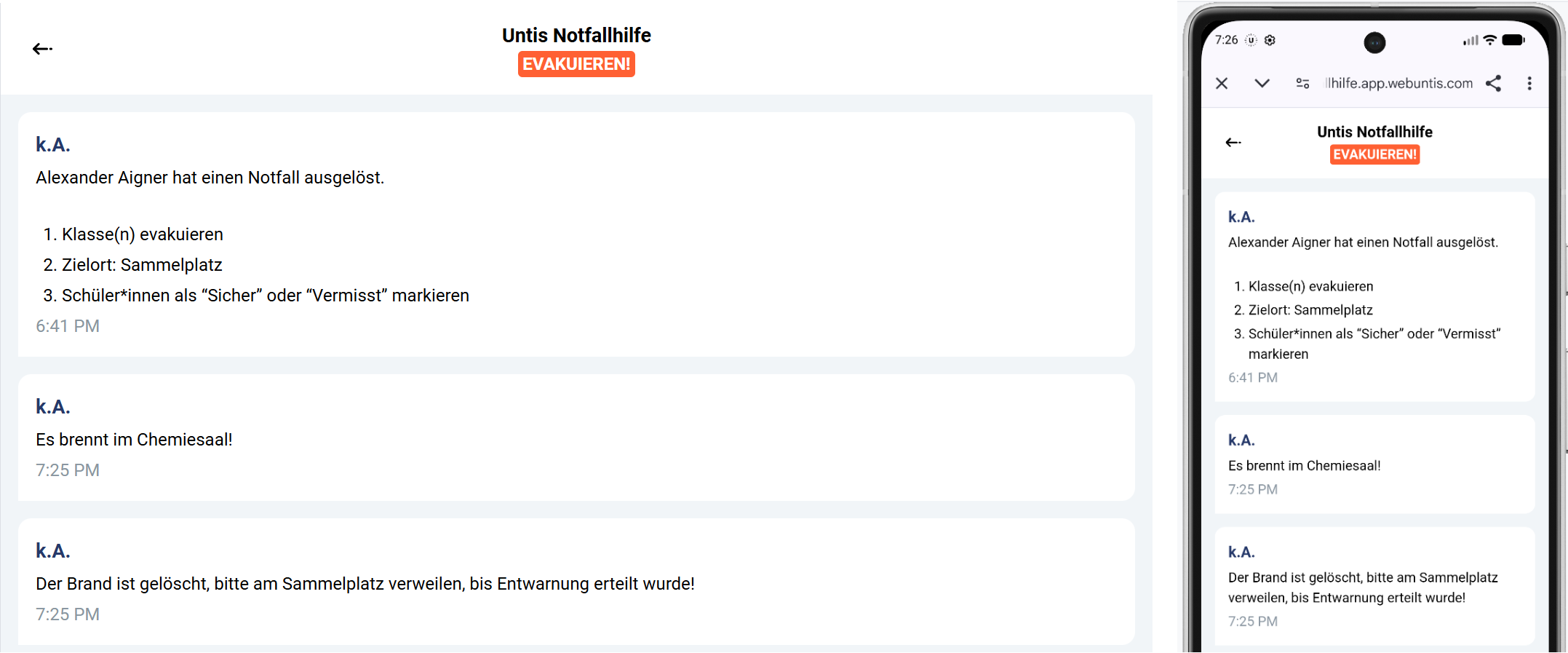 Wird ein Notfall über die Untis Notfallhilfe ausgelöst, werden schulinterne Personen über das Mitteilungssystem benachrichtigt. Diese Mitteilungen umgehen Stummschaltungen von mobilen Geräten nicht und sind daher kein Alarmierungsersatz. Die Notfallhilfe ist vielmehr als interaktiver Ersatz zur bisherigen Notfallliste zur Unterstützung bei der Sicherung aller Schüler*innen vorgesehen.