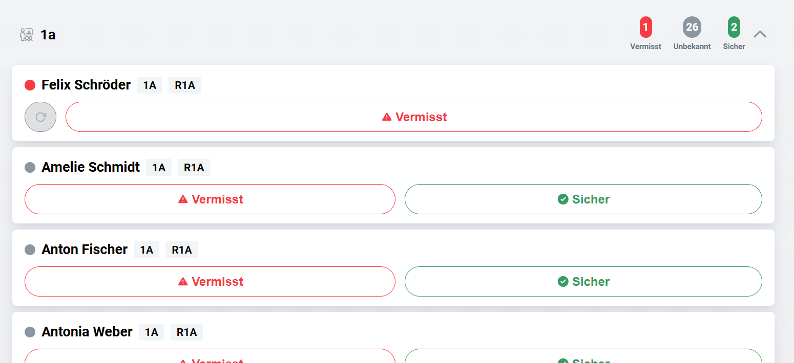 Schüler*innen, die als sicher markiert wurden, wandern in der Ansicht nach unten. Schüler*innen, die hingegen als vermisst markiert wurden, werden in der Liste ganz oben angezeigt.