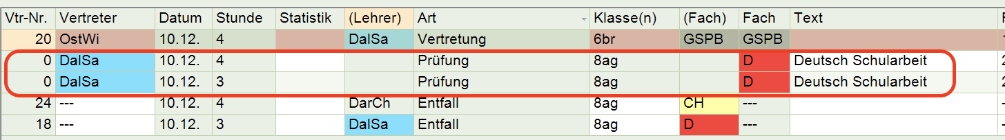 Regeln Sie nun wer die Aufsicht zur Prüfung halten soll (im konkreten Fall bleibt der Deutschlehrer DalSa auch in der 4. Stunde in der Prüfung -> seine eigentliche Unterrichtsstunde muss vertreten werden).