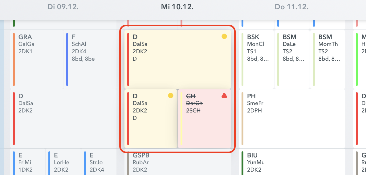 Die Anzeige der Prüfung im WebUntis-Stundenplan sieht folgendermaßen aus: Mittwoch 3./4. Stunde findet die Deutsch Klausur statt. Der CH Unterricht in der 4. Stunde entfällt.