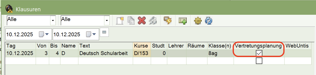 Die Spalte <Vertretungsplanung> muss aktiviert werden, um die Klausur in der Vertretungsplanung verwalten zu können.