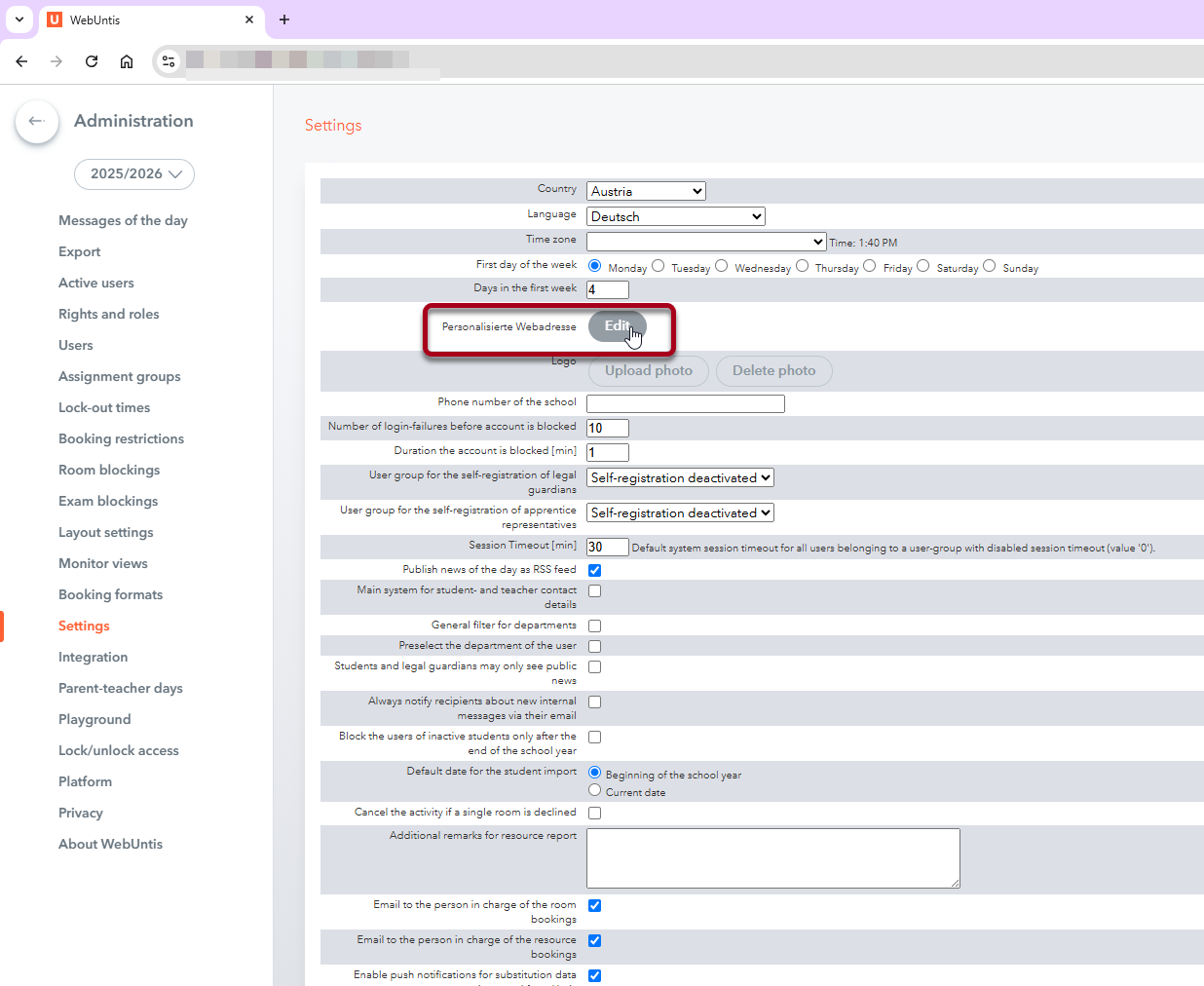 You can see what your new web address will look like during the transition phase starting on 12 November in WebUntis under ‘Administration | Settings’.