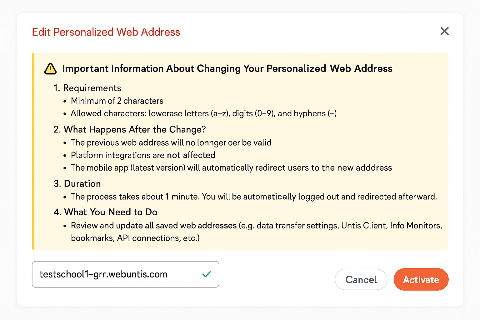 Yes, you can rename the WebUntis web address at any time (even multiple times) after December 3rd. However, please note that renaming always requires the adjustments described above.